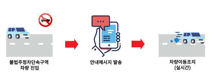 - 서비스 내용 : 불법 주정차 단속 CCTV 운영 지역임을 운전자의 휴대폰 문자로 안내하는 서비스입니다.