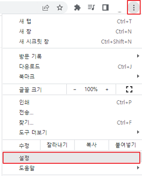 1. 크롬 브라우저 화면 오른쪽 상단에 점 세 개 모양(더보기)을 클릭하여 "설정"을 선택합니다.