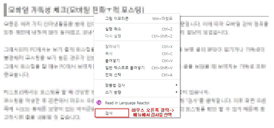 1) 포스팅을 작성한 후 본문에서 마우스 오른쪽을 클릭해서 나오는 메뉴에서 맨 아래 “검사”를 클릭합니다.