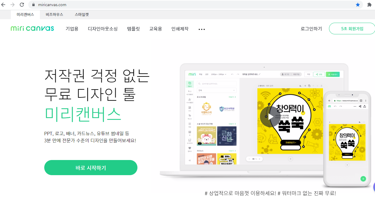 저는 여러 가지 무료 디자인 플랫폼 중에서 "미리캔버스"라는 프로그램을 사용 중인데 무료인데도 크게 제약도 없는 편이고, 간단한 디자인을 하기에는 수월하며, 거기에다가 이미지를 올릴 때 가장 주의해야 하는 저작권 문제 또한 디자인 플랫폼에 있는 이미지를 잘만 사용하면 크게 걱정하지 않아도 되기 때문에 이 프로그램을 자주 사용을 하고 있습니다.