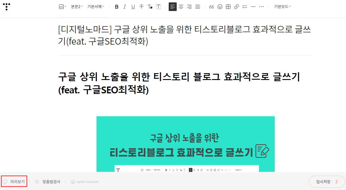 두 번째는 글쓰기 하단에 위치한 미리보기 기능입니다. 글을 쓰고나서 미리보기 기능을 통해서 내가 원하는 글의 구성이 맞는지, 글자체와 이미지등은 잘 적용되었는지를 최종적으로 한번 더 체크한다면, 발행 후에 두번 세 번 수정해야 하는 번거로움이 훨씬 줄어들어 훨씬 효율적인 글쓰기를 실행할 수 있습니다.