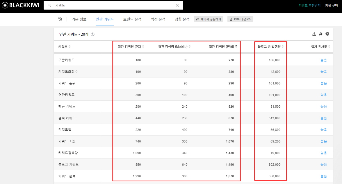 저는 주로 키워드 조회 사이트 중에서는 "블랙키위"나 "키워드마스터"라는 사이트를 통해서 검색량을 조회하고 키워드를 찾는 편인데, 이는 특정 사이트가 좋다라기 보다는 본인이 보기에 좀 더 활용도가 높고 편안한 사이트를 이용하시는 것이 좋습니다.