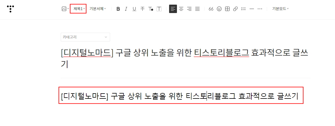조금 더 자세하게 설명을 하면, 먼저 포스팅 제목 입력란에 제목을 쓰고 본문 글쓰기 부분에서도 첫 번째 줄에 들어가는 내용에 포스팅 제목을 한번 더 써줍니다. 그리고 본문 첫째줄 제목에는 반드시 상단에 글상자 문단 모양을 “제목1(h1태그)*”로 설정을 해주셔야 중요 내용으로 인지를 하여 검색엔진에서 내 블로그의 내용을 잘 수집해준다고 합니다.