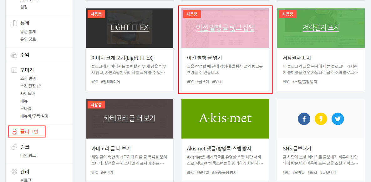 2) 플러그인 페이지에 들어가서 플로그인 항목들 중에서 “이전 발행 글 링크 삽입”항목을 확인하고 사용 중으로 표시가 안 되어 있다면 해당 플러그인을 클릭합니다.