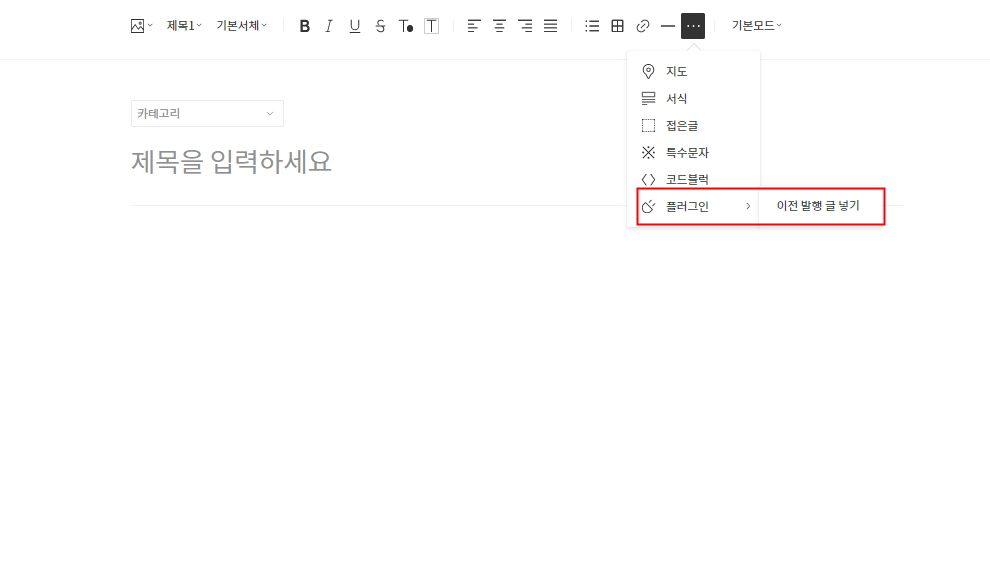 1) 설정이 완료되면 글쓰기 페이지로 돌아와서 본인이 이전 발행 글 링크를 삽입할 부분에 위쪽 오른쪽 상단을 클릭하여 플러그인->이전 발행 글 넣기를 클릭합니다.