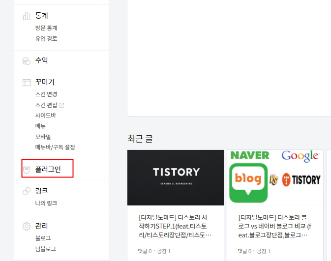 1) 티스토리 관리자 페이지로 들어가서 왼쪽 하단 플러그인 탭을 클릭합니다.