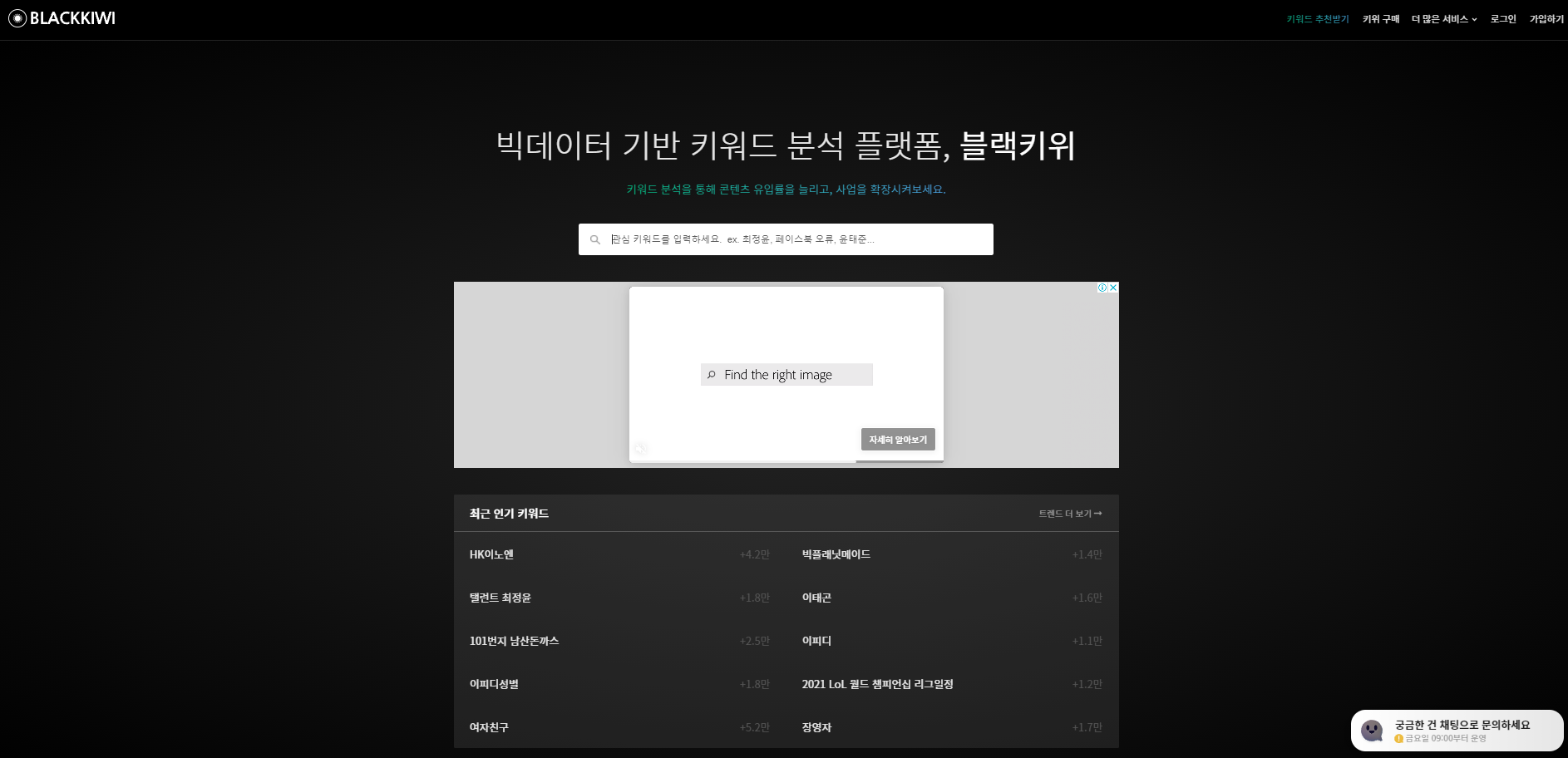블랙키위는 키워드를 조회하는 대표적인 사이트 중 하나로 빅데이터 기반 키워드 플랫폼입니다. 블랙키위는 최근 인기 키워드를 통해 트렌드를 파악할 수 있고, 키워드를 검색 시에도 어렵지 않고 깔끔하고 보기 편한 화면 구성과, 검색량/블로그발행량/연관키워드/검색동향/섹션 배치 순서 등을 제공하고 있어 키워드를 조회하고 활용하기에 유용한 사이트입니다.