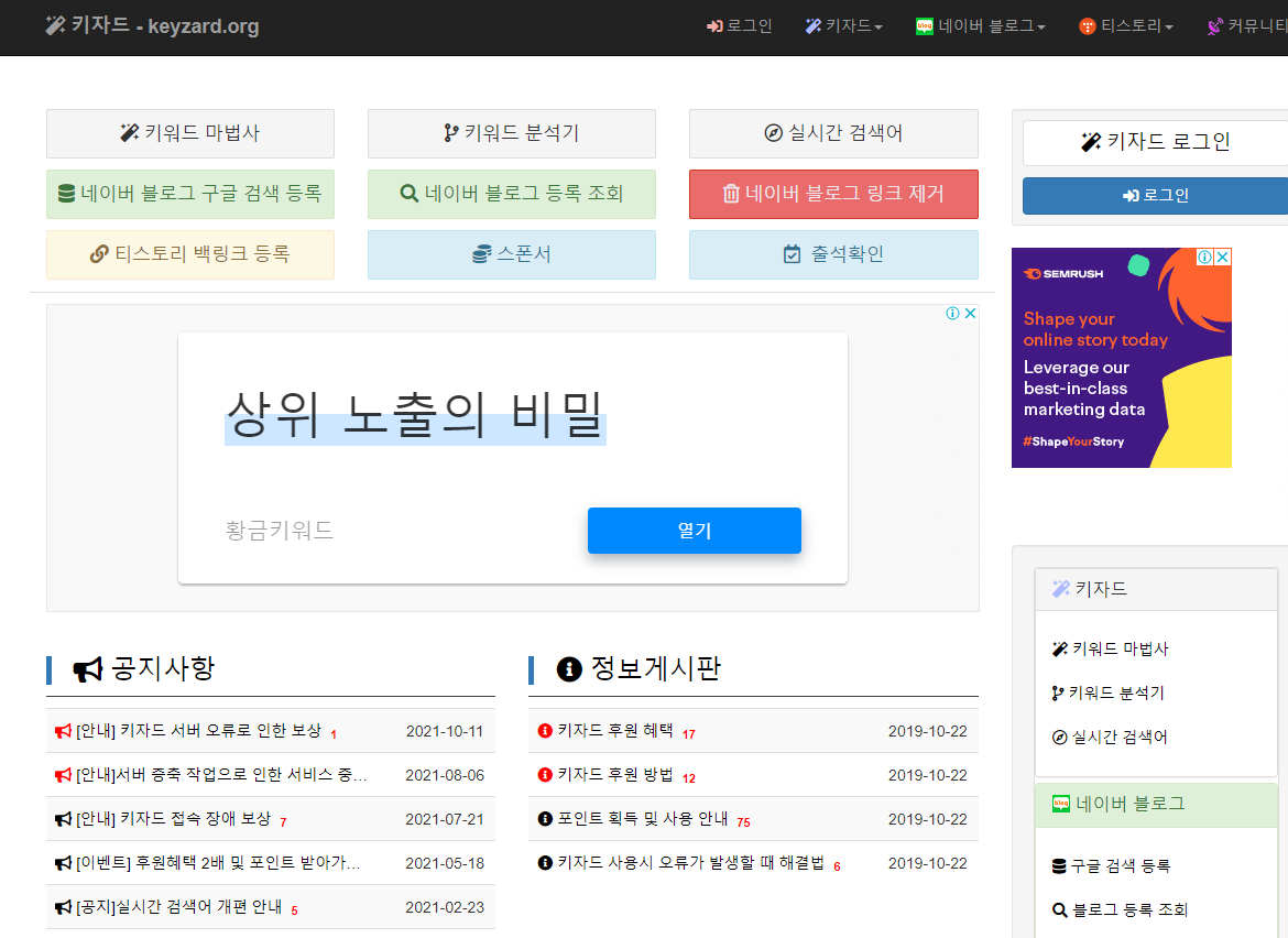 키자드는 블로그 운영에 유용한 키워드 정보(검색량, 분석)를 제공하는 사이트로 구글 검색 지원 및 SEO최적화에 필요한 백링크 등록도 지원을 하고 있는 플랫폼입니다. 또한 티스토리 백링크 등록 서비스도 제공하고 있기 때문에 키워드와 더불어 유용한 사이트입니다.
