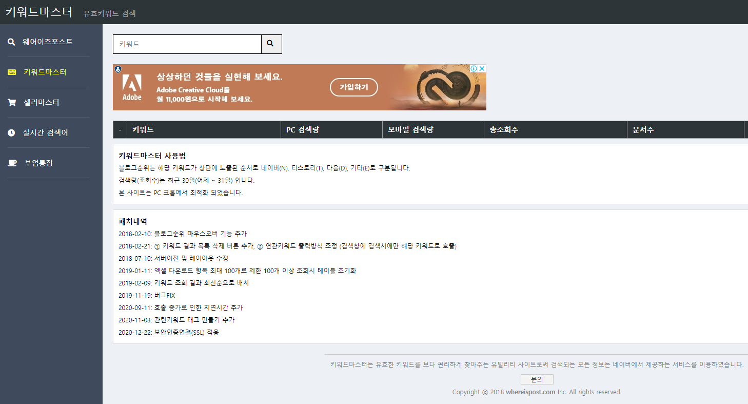 웨어이즈포스트는 블로그 검색 누락 체크툴로 최근 자주 발생하는 블로그 통 누락 및 발행 글 일부 누락 여부를 쉽게 확인하기 휘해 만들어졌다고 합니다. 키워드마스터에서 상단 웨어이즈마스터 부분을 눌러주고 검색창에 나의 블로그 주소를 입력하면 내가 발행한 글이 정상 노출되고 있는지를 확인할 수 있습니다. 하지만 아마도 아직은 네이버블로그 영역에서만 확인이 가능한 기능으로서 티스토리를 운영하는 사람들에게는 조금 아쉬운 부분인 것 같습니다.