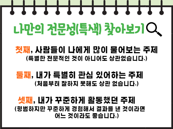 그래도 전문성이란 단어에 마냥 부담을 느끼고 그래도 잘 모르겠다 싶으시다면, 아래의 세 가지를 한번 떠올려보고 노트에 이러한 커다란 카테고리를 만들어서 한번 답을 적어보는 것을 추천드립니다.