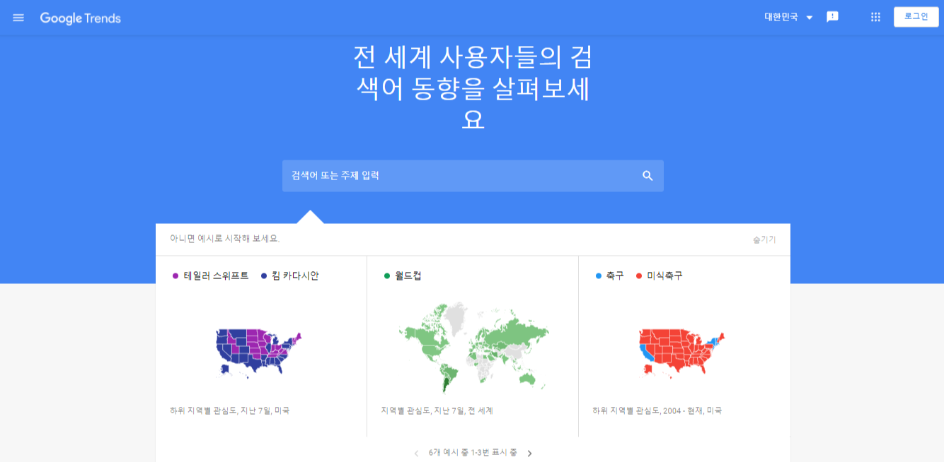 구글 트렌드는 Google에서 나오는 최신 트렌드, 데이터 및 시각화 정보를 확인할 수 있는 사이트로 타 검색 플랫폼들처럼 검색어를 입력해서 검색량이나 블로그 발행량 등이 수치화되어서 보이지는 않지만 구글에서 나오는 최신 트렌드나 세계적으로 관심이 있는 검색 어등을 파악할 수 있어 큰 틀의 주제를 정하는데 참고하기에는 유용한 사이트입니다.