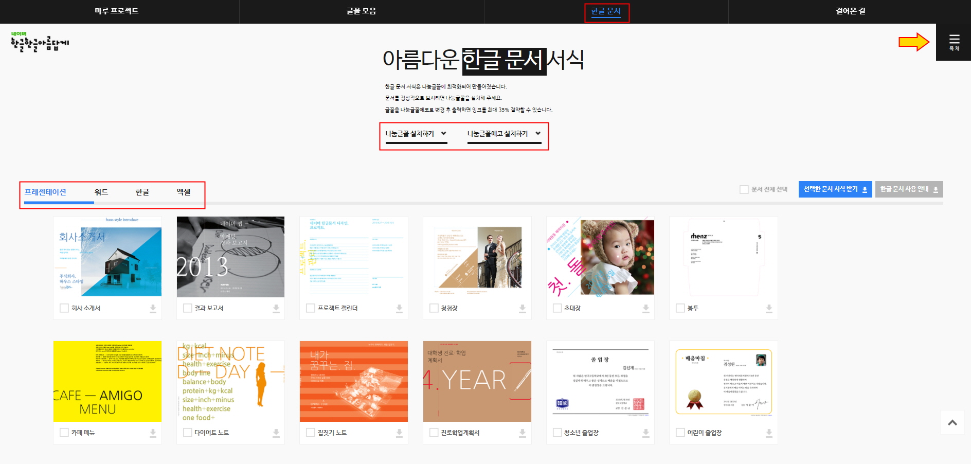 그리고 한 가지 더 유용한 정보로는 다시 오른쪽 상단 "목차"에서 “한글문서”로 들어가면 다양한 한글 문서서식 또한 무료로 배포 중입니다.