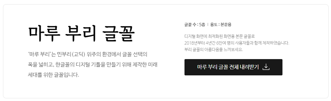 그리고 두 번째 글꼴 수 5종에 본문용으로 쓰기 유용한 “마루 부리 글꼴”이 있습니다. “마루 부리”는 민부리(고딕) 위주의 환경에서 글꼴 선택의 폭을 넓히고, 한 글꼴의 디지털 기틀을 만들기 위해 제작한 미래세대를 위한 글꼴이라고 합니다. “마루 부리글꼴" 서체를 클릭하면, 상세페이지에 타입은 명조(부리) 1종류이고 굵기가 다른 5종을 제공하고 있습니다.