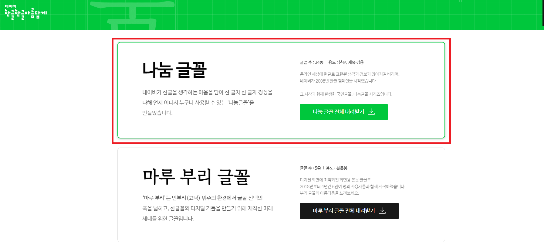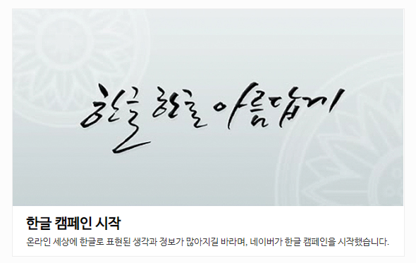 네이버에서는 우리 한글을 아끼고 널리 퍼트리자는 한글한글 아름답게 캠페인의 일환으로 2008년부터 개발하고 배포한150여 종의 폰트들을 무료 배포하고 있습니다. 이러한 캠페인은 온라인 세상에 한글로 표현된 생각과 정보가 많아지길 바라며, 네이버가 2008년부터 지금까지 한글 캠페인을 이어오고 있다고 합니다.