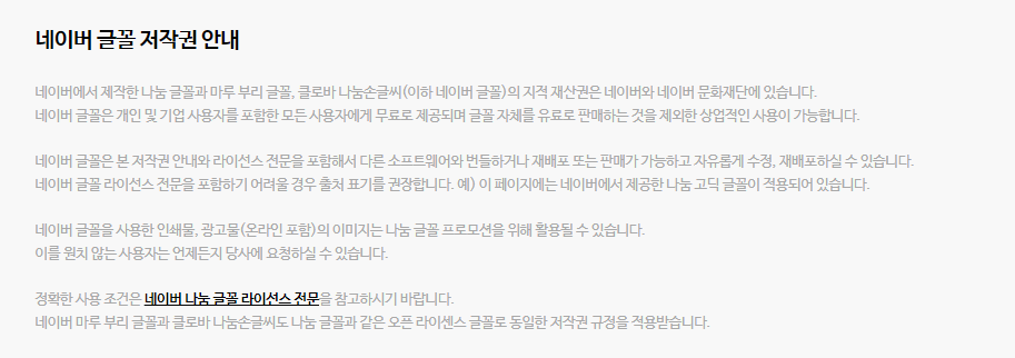 참고로 네이버 글꼴은 개인 및 기업 사용자를 포함한 모든 사용자에게 무료로 제공되며 글꼴 자체를 유료 판매하는 것을 제외한 상업적인 사용이 가능하다고 하니, 이러한 나눔으로 인하여 온라인 속에서 한글이 더욱더 인정받고 사랑받는 문자가 되길 저 또한 바라는 바입니다.