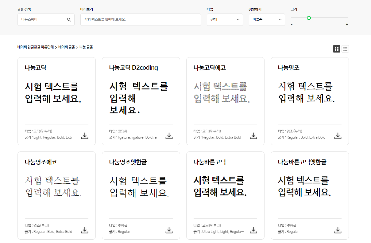 첫 번째 글꼴 수 34종에 본문, 제목 겸용으로 쓰기 유용한 “나눔글꼴”이 있습니다. 나눔글꼴 서체를 클릭하여 들어가면 여러 가지 타입과 굵기의 글꼴들을 제공하고 있고, 글꼴은 시험 텍스트를 통하여 미리 보기도 가능하니 참고해서 내가 사용하고 싶은 글꼴을 다운받을 수 있습니다.